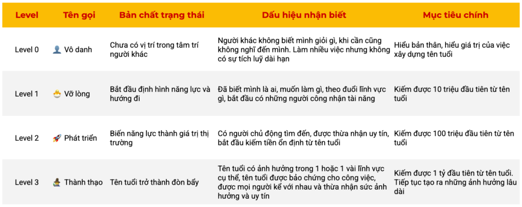 Là 1 người chơi cũng kha khá game thời còn đi học, tôi nghĩ rằng cách diễn đạt của game là 1 trong những thứ gần gũi và dễ hiểu bậc nhất. Vì thế giống như 1 game nhập vai, bằng kinh nghiệm của mình, tôi cũng thiết kế và chia việc xây dựng tên tuổi ra thành các level để bạn có thể tự nhận định như bảng dưới đây: