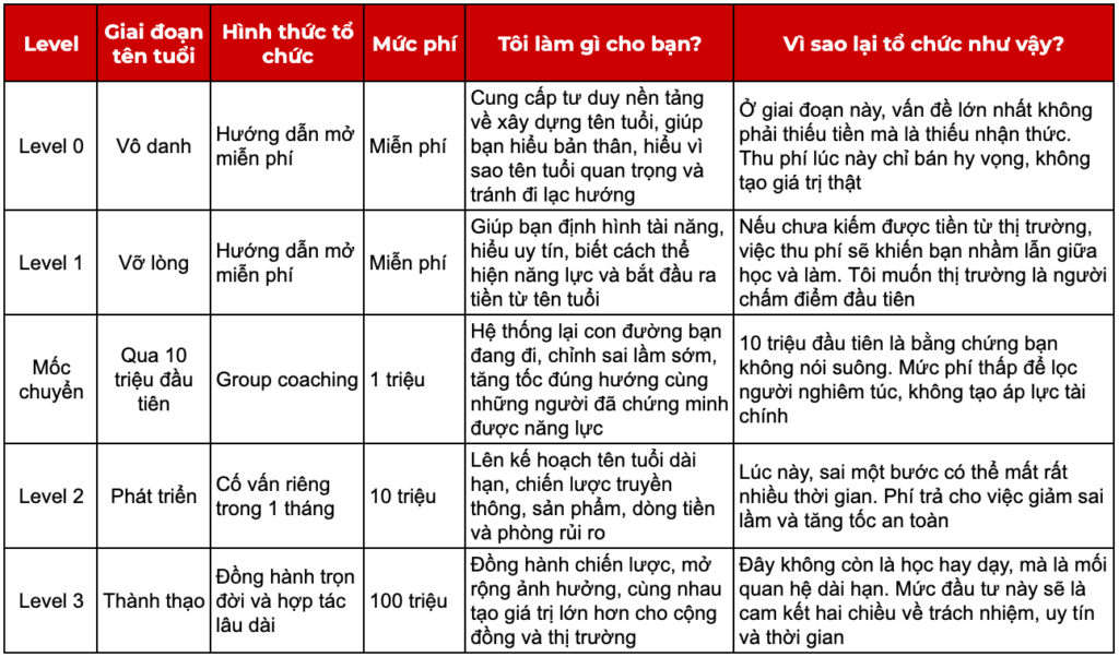 - Tư vấn 1-1: Với mong muốn review lại, lên kế hoạch, định hướng lại lộ trình dài hạn, tôi muốn cùng bạn dành ra 1 tháng để lên chiến lược đủ kỹ và đủ sâu trên hành trình xây dựng tên tuổi của bạn. Việc nghiên cứu dữ liệu quá khứ rất quan trọng, và với mức phí tư vấn riêng cũng không rẻ, nên hoạt động này sẽ phù hợp với những anh chị em đã qua level 2, tức là chứng minh được năng lực và tên tuổi của bản thân. (100 triệu đầu tiên)